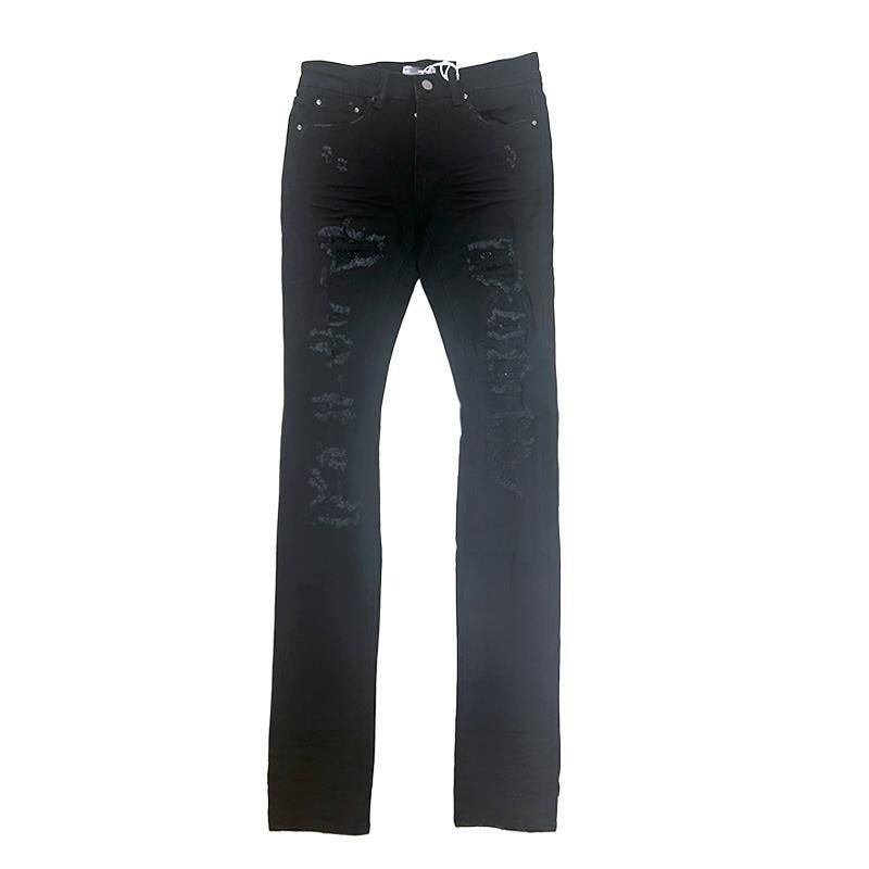 大胆にダメージ加工を施し、ダメージを補修するように当てられたピンタックのペイズリー柄の生地が印象的なデザインのジーンズ。脚長美脚効果を演出するスキニースリムフィット。ストレッチ素材のためタイトな細身シルエットながら履き心地も抜群。