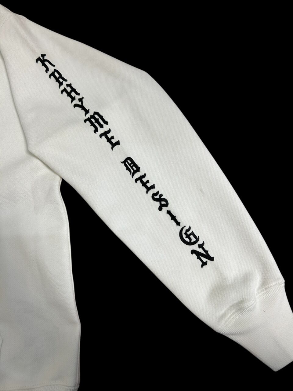 KDロゴをサガラ刺繍で施し、右胸へチェーンステッチ、両袖へブランドロゴをプリントを施した手の込んだ1枚。