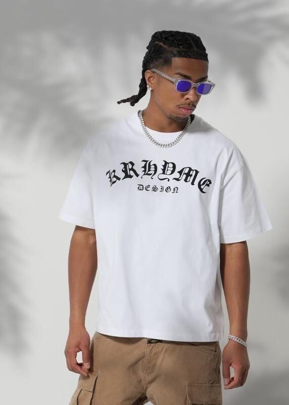 存在感のあるゴシック調ロゴが印象的な、KRHYME DESIGNの半袖Tシャツ。