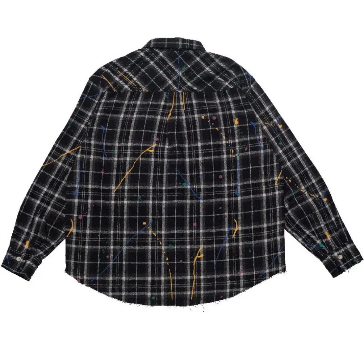 ペンキをボディ全体に散りばめたフランネルシャツ。ブランドネームを省略化したデザインのレザータグを胸部分にセット。