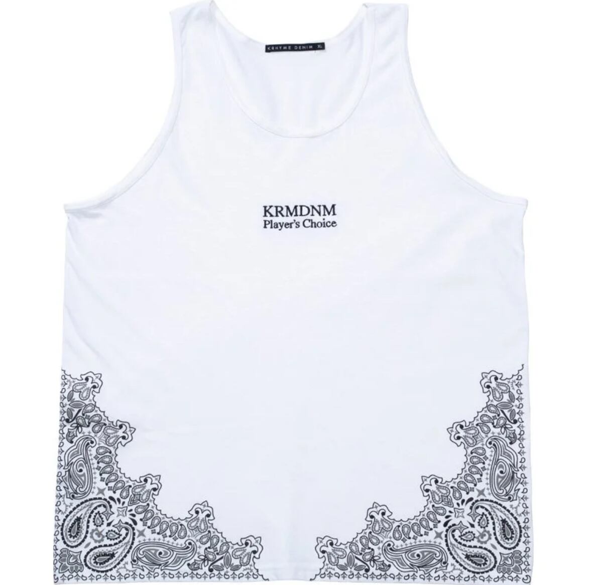 タンクトップの裾に発泡プリントでバンダナデザインを立体的に表現。胸元にはブランドネームの略称ロゴを刺繍。