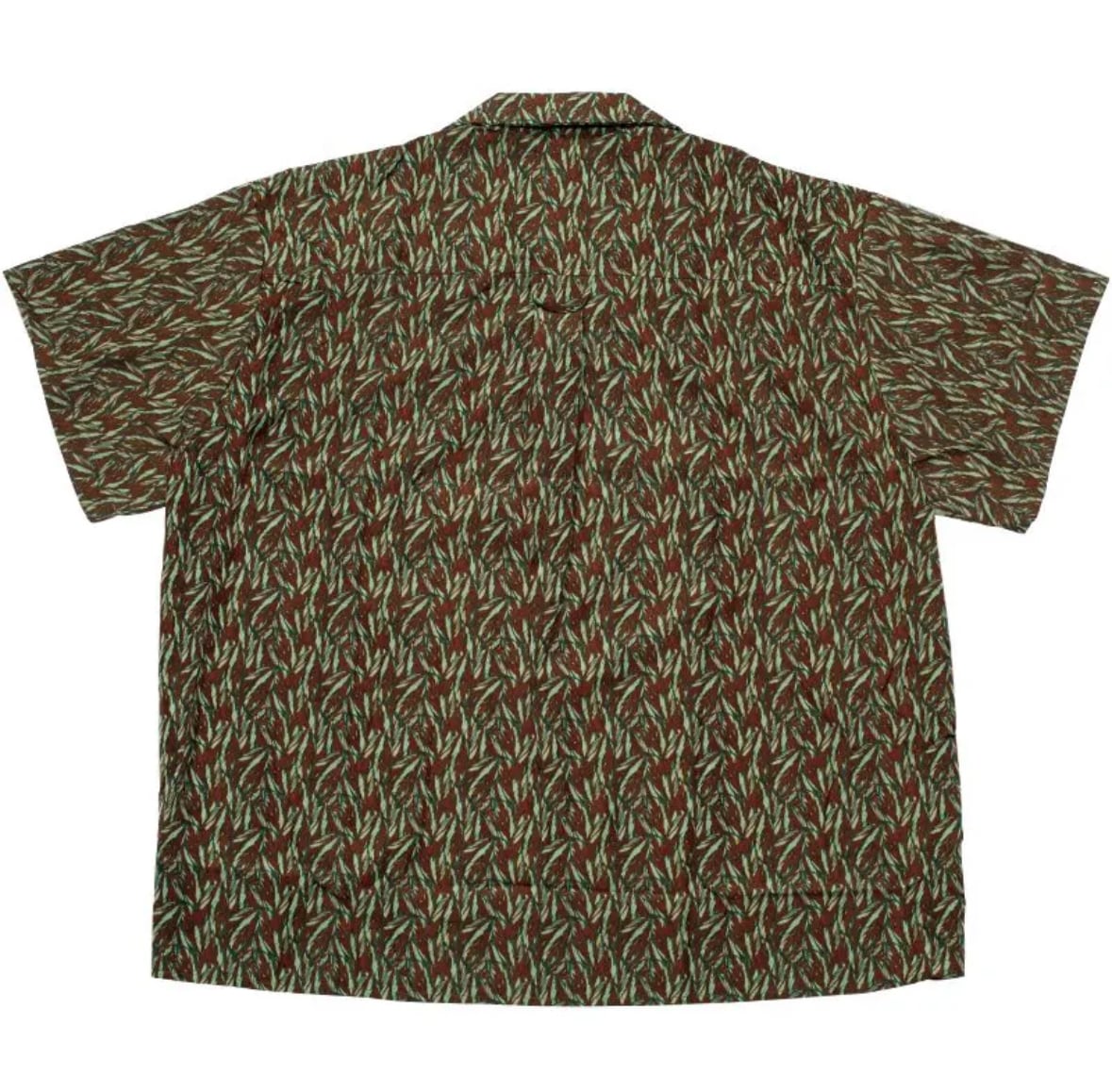 たくさんのリーフが重なったプリントシャツ。ダークグリーンボディは衿元に、ブラウンボディへは胸元に、それぞれ異なるブランドロゴを刺繍したデザイン。 100%ポリエステルの生地で暑い季節にもさらりと着られます。