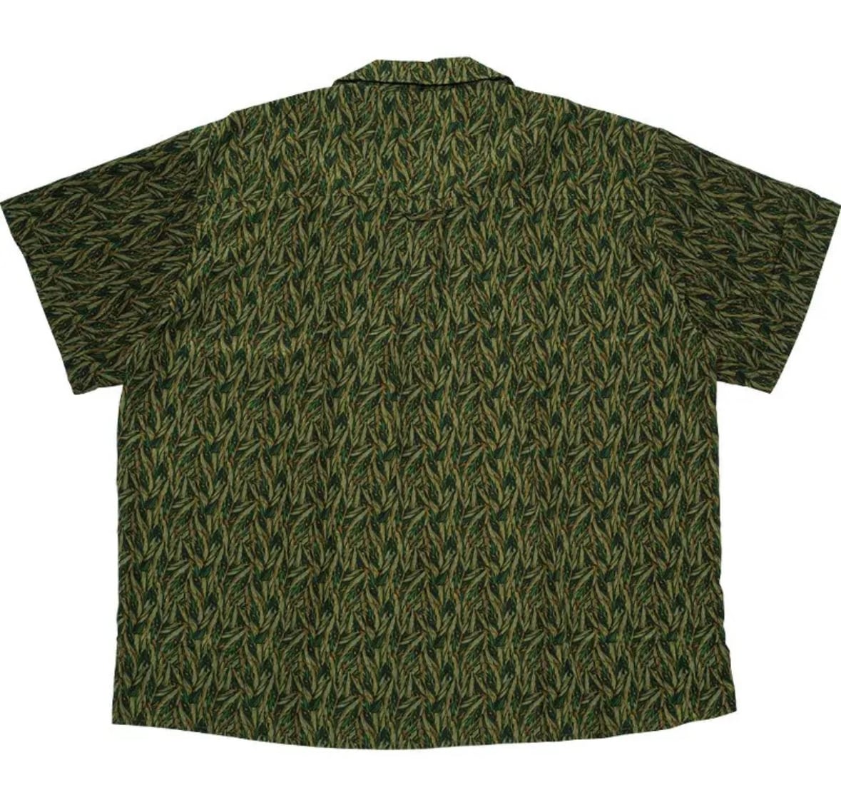 たくさんのリーフが重なったプリントシャツ。ダークグリーンボディは衿元に、ブラウンボディへは胸元に、それぞれ異なるブランドロゴを刺繍したデザイン。 100%ポリエステルの生地で暑い季節にもさらりと着られます。